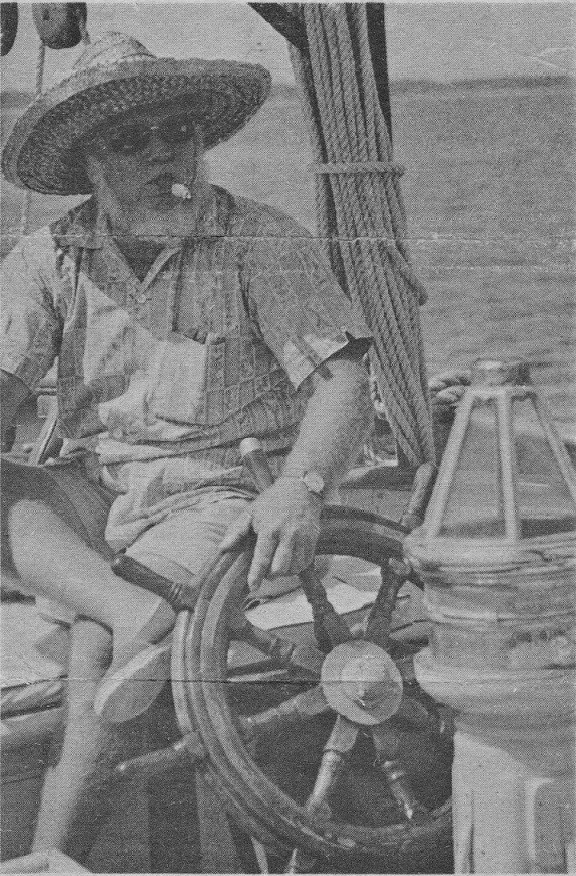 Captain John L. Weeks Jr. at the helm of his 50-foot Alden schooner, Heron