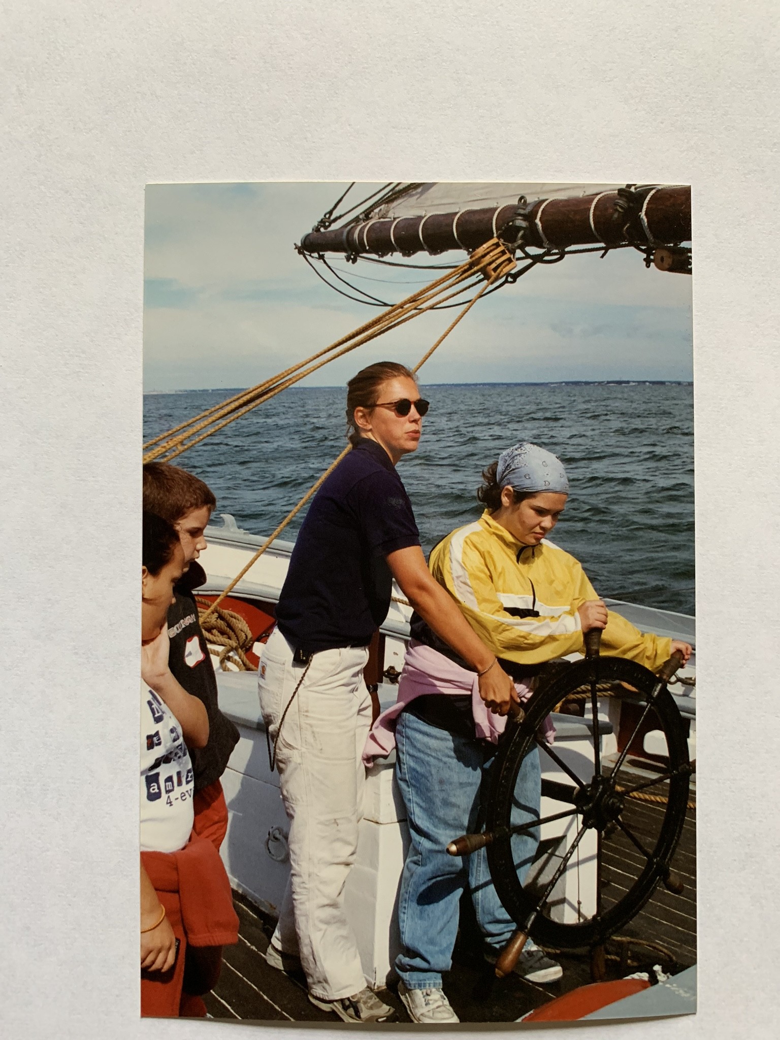 Meg Graustein helping a student learn to handle the helm.