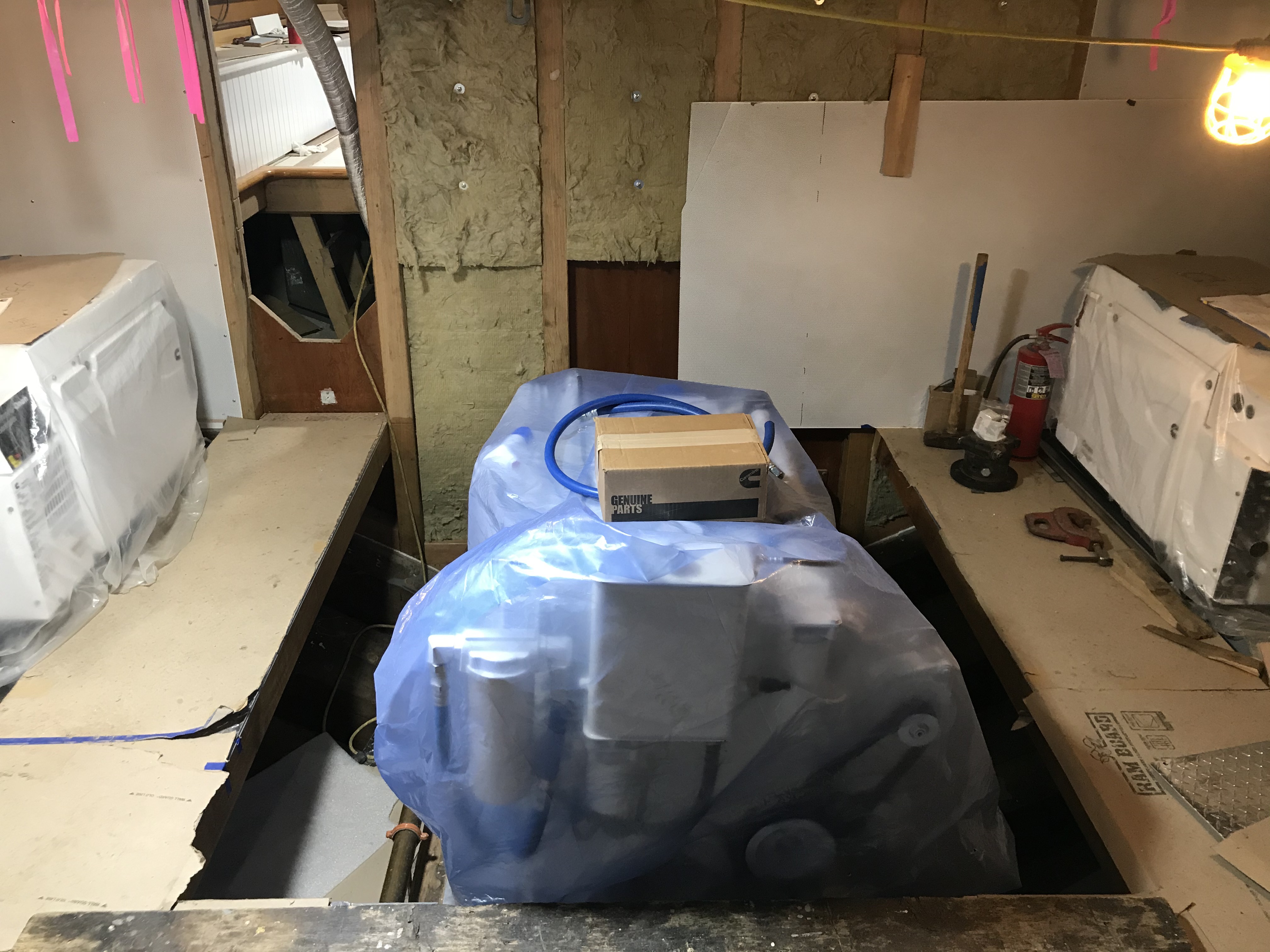 It was an exciting day last week when the brand-new propulsion engine and transmission landed in the ship. The combination of engine and drive gear was too large to ship as a complete unit, so each were hoisted independently before being mated once they were both in the engine room. The engine is a Cummins QSM11 (350hp) engine with a TwinDisc hydraulic transmission.