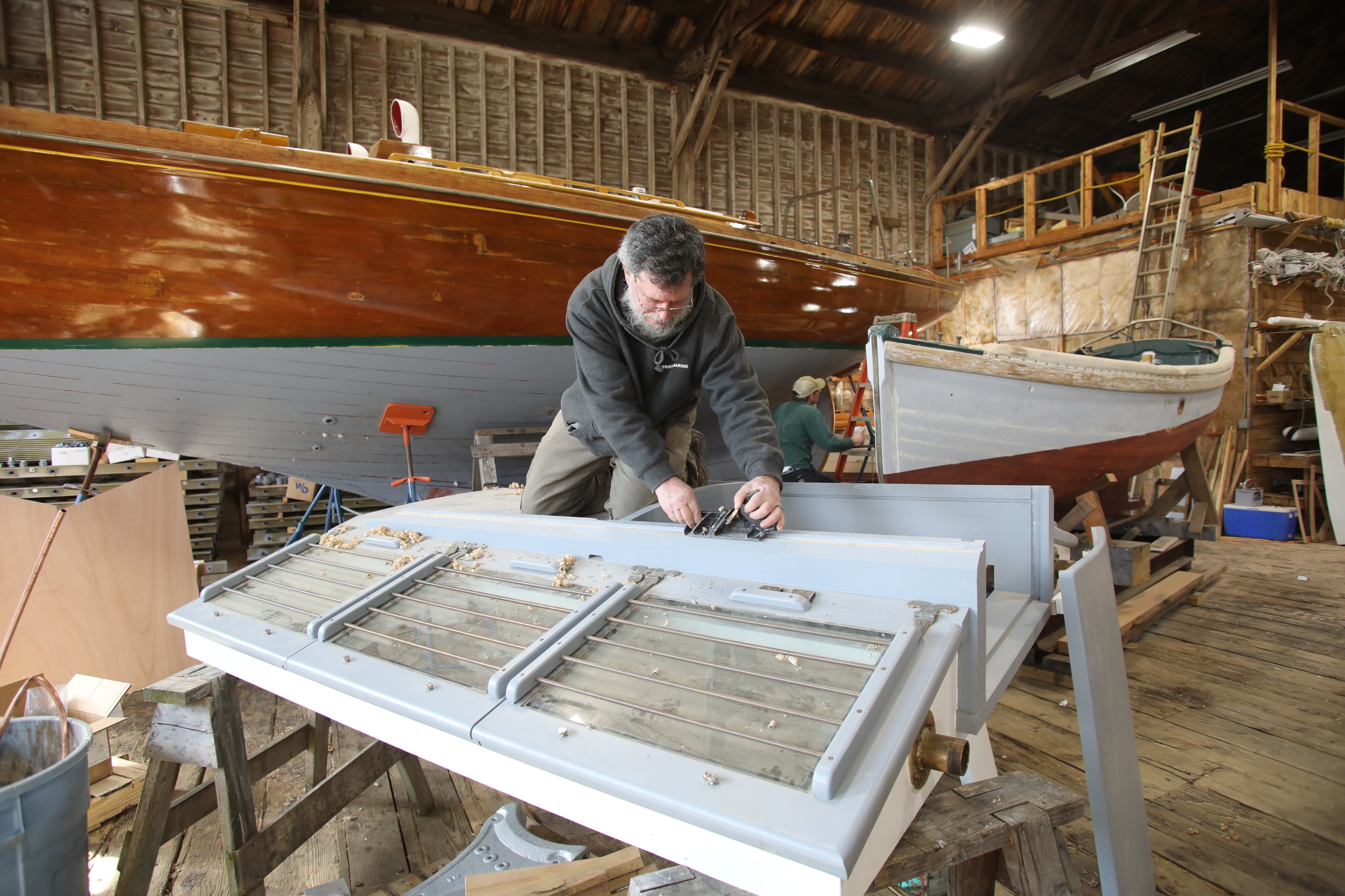 Fitting Hardware Our lead Shipwright David Short is finishing a detailed installation of the sliding hatchway for the Engine Room deck house. Just a few hardware details are all that remain for the three primary deck houses. We welcome the warmer weather for exterior projects like this. Photo Credit: Robert Mitchell of Mitchell Photography