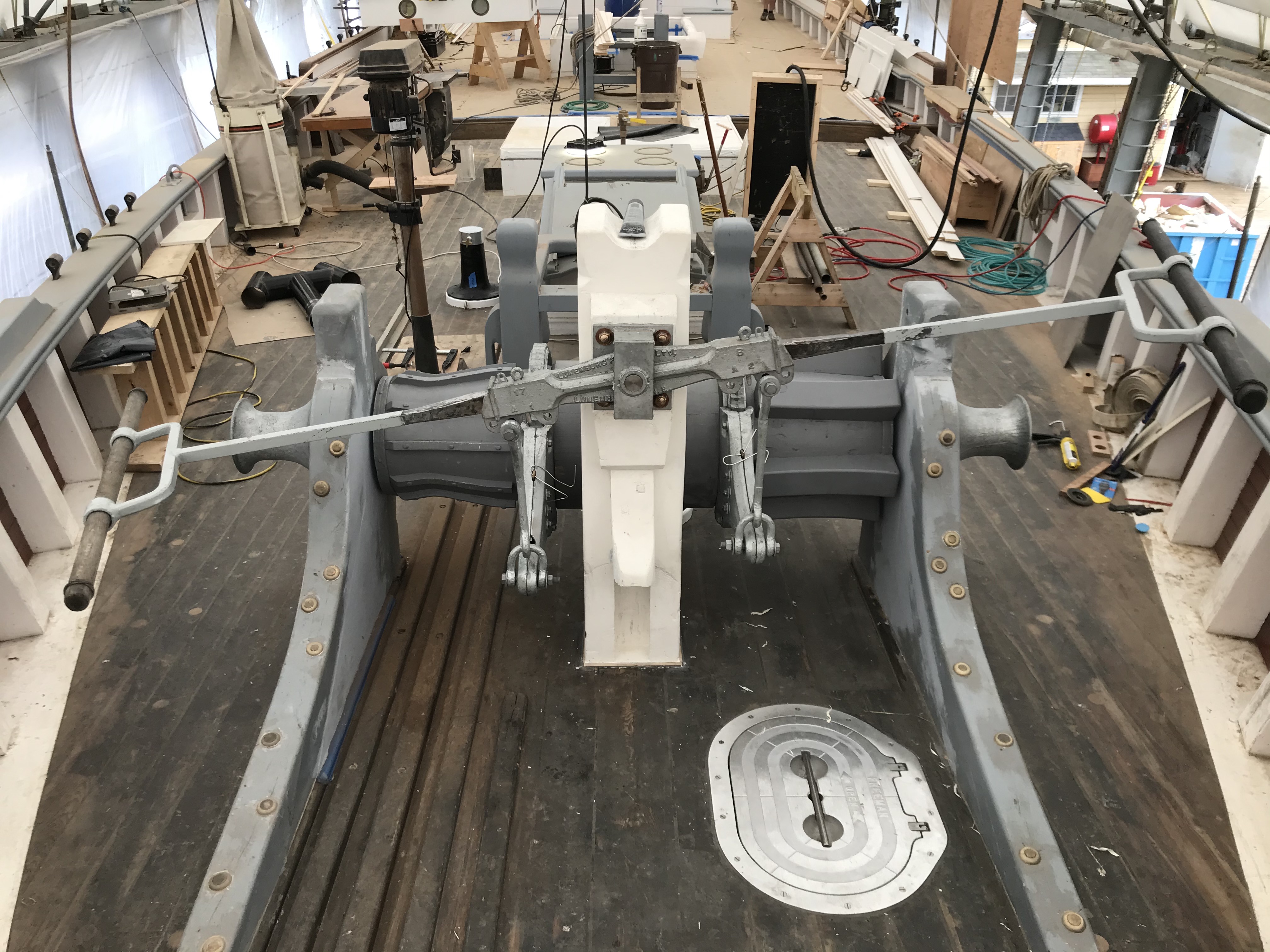 Fully mounted and operational, this replica of a traditional windlass from the late 19th century sits oiled and ready for use. In a operational “pull” test, with four shipwrights manning the lever arms, we managed to pull approximately 6200lbs of pressure. We were all very impressed with this simple yet effective piece of machinery.