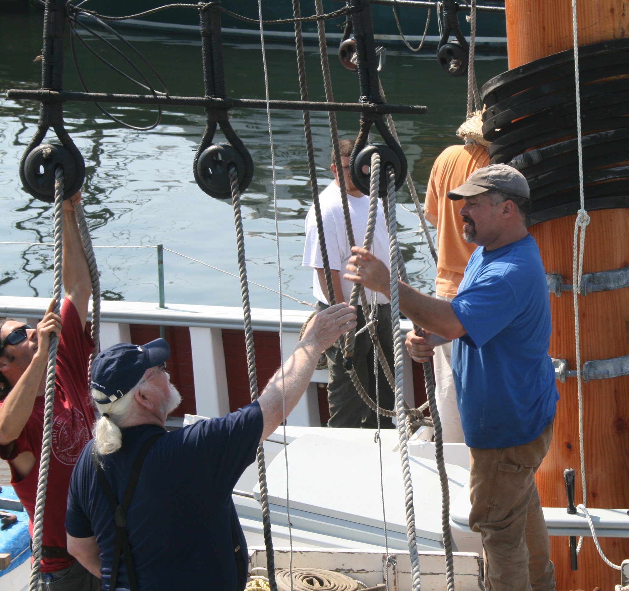 Bookmark the permalink.Steve Kirk, Marty Casey (center) and SEMA director Willi Bank Reeving the starboard foremast lanyards last May when the mast were raised.