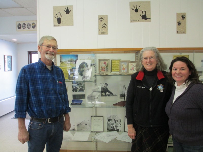 Ernestina Commissioner Fred Sterner, SEMA director Mary Anne McQuillan and Norcross WS’s Jennifer Ohop by a display of Norcross memorabilia, some showing his voyages with Bartlett.