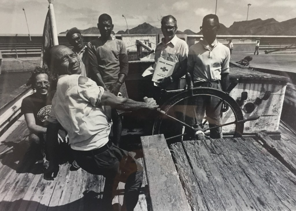 We are nearing the 37th anniversary of Ernestina-Morrissey’s return to Massachusetts as a gift to the people of the United States from the Republic of Cabo Verde. John Braman recently sent us this story about some of the efforts to make that return possible. He was the “Representative of Friends of Ernestina” in Cape Verde, funded by an Arnold Fellowship from Brown University in 1977. He lived in Mindelo for about 6 months, working with the government on the vision for the ship’s purpose in the U.S. and ways to fund the restoration. He interviewed most of the crew of the 1975 attempted crossing. In a rolling sea, running downwind, the main boom jibed across with such force that the stays parted, and down went the mast. A very close call for the crew! And all of this happened only a few miles from port!”