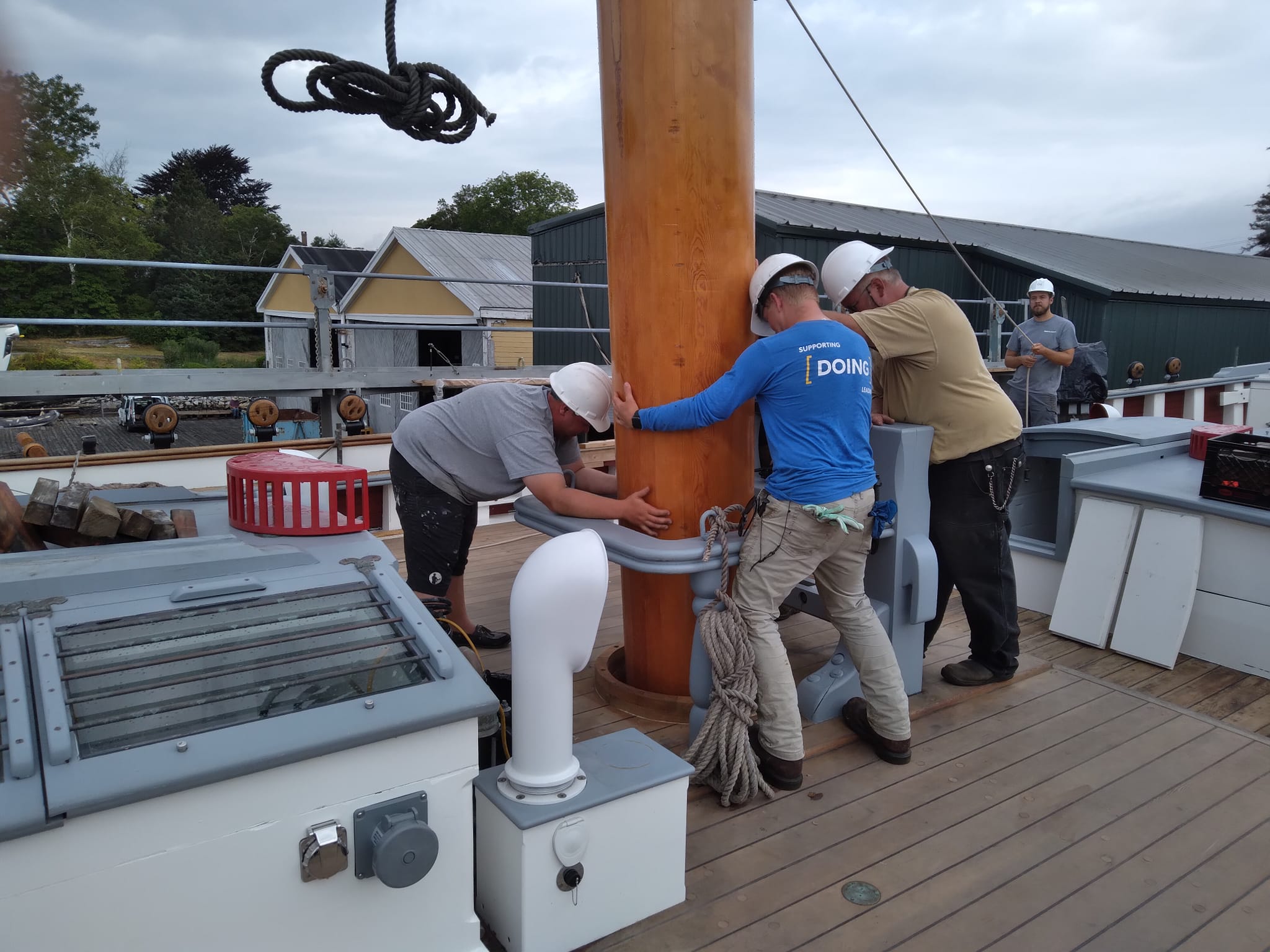 The main mast being guided by the crew on deck as the crew below gives directions to line up the tenon to the mortice and set the mast into the step.