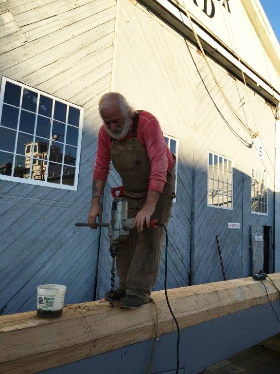 Capt. Dave Thompson standing next to the aft end of the new keel for scale. The grey part is the four sections of lead ballast. The ends of the keel will be faired into the hull. photo credit Harold Burnham
