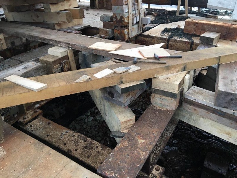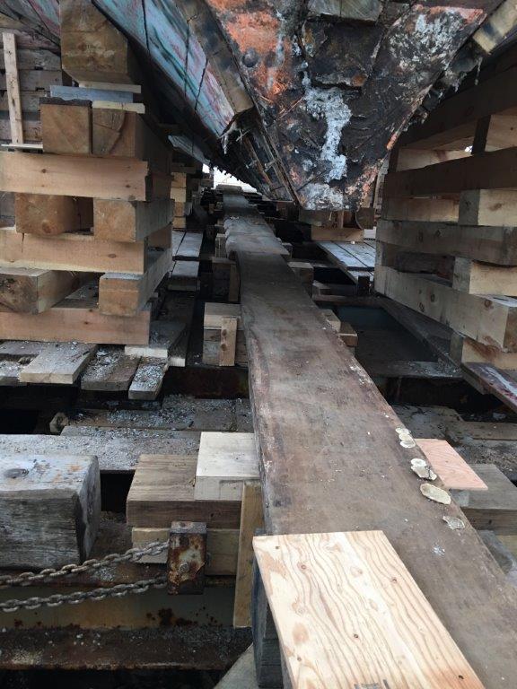 The shipyard crew is constructing a ramp system to bring the keel in place under the ship. photo credit Harold Burnham