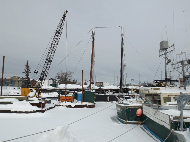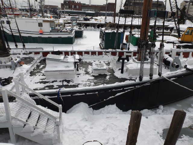 The winter cover was not installed this year because we all anticipated a break in the weather to allow the ship to be moved to Boothbay Harbor Shipyard by now. With no winter cover, Supervisor Paul Alexio and all the DCR staff helping him have done an amazing job to keep Ernestina-Morrissey safe.