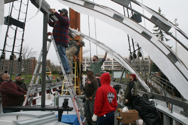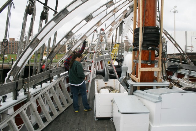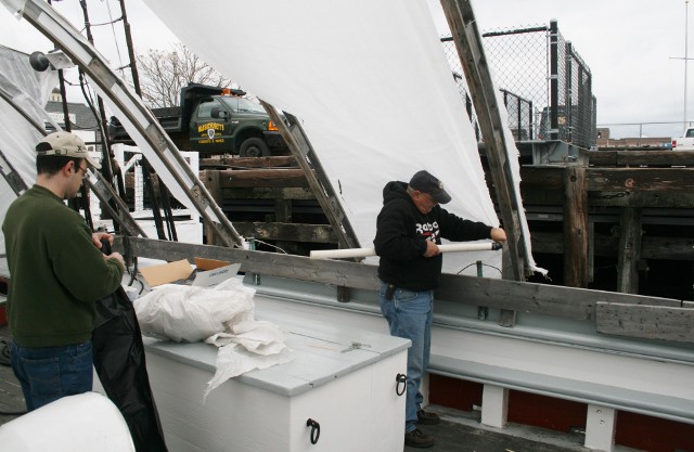 Despite the rain over 20 volunteers mustered to help take off the winter cover. With the assistance of several DCR staff and an early start, the job was done before noon. Some of the crew started at 8 am to try to get ahead of the forecasted rain and despite of reports of downpours in other areas the heaviest rain held off until the job was done. Ernestina ex Effie M. Morrissey is Massachusetts’ Official Vessel and the volunteers were proof of that with some traveling from Boston and the western part of the Commonwealth to help out.