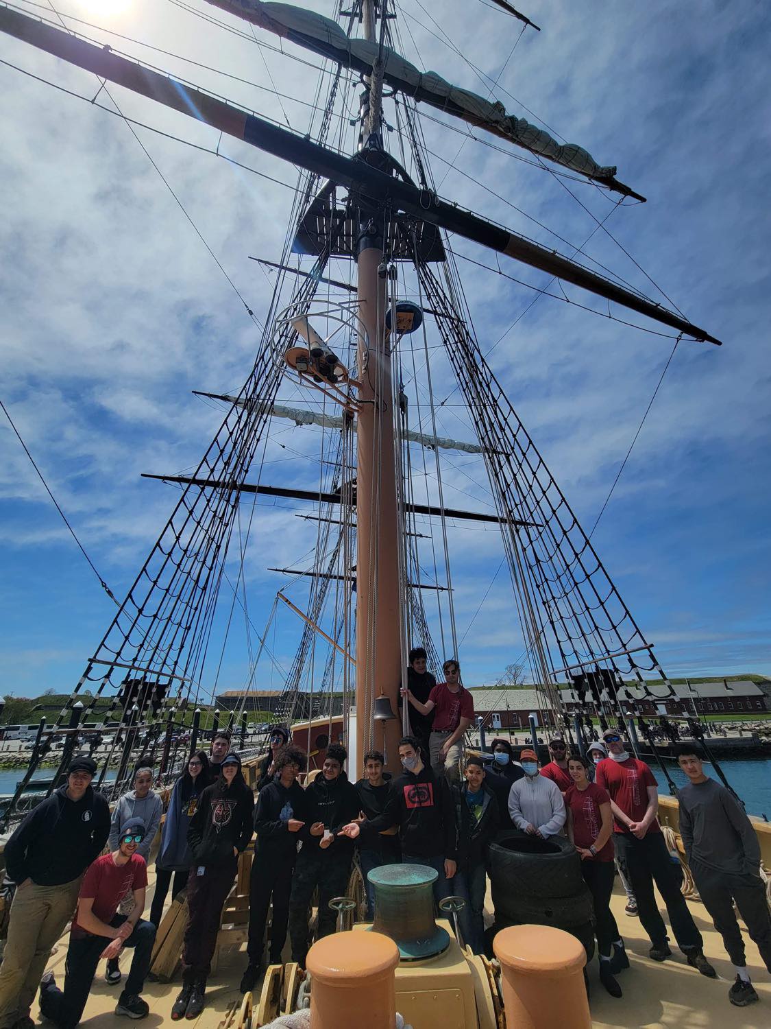 The crew and trainees aboard the SSV Oliver Hazard Perry with their water sample.