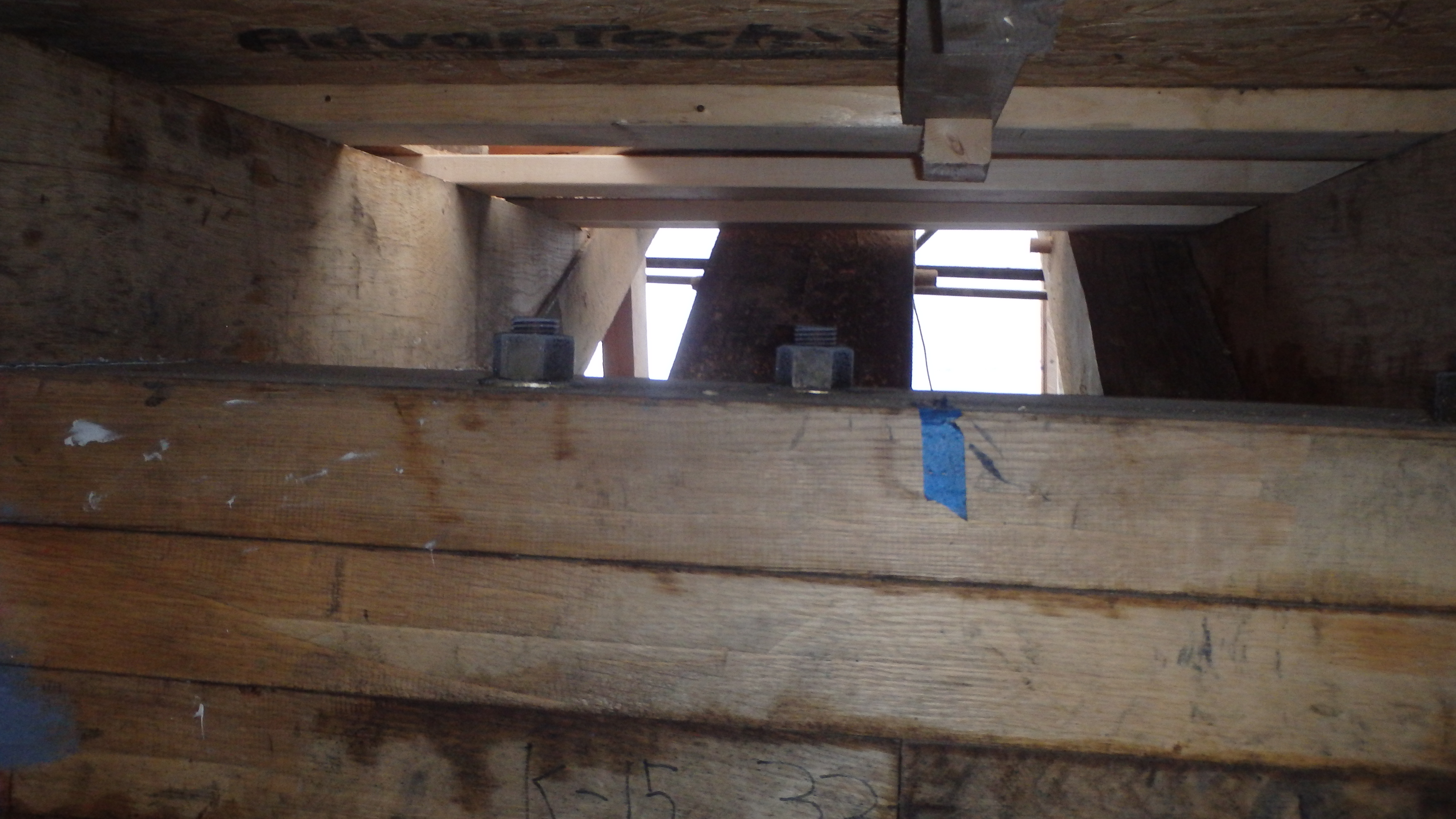 A close look at the laminated keelson. The bronze nut caps a rod that passes down through the layers of keelson, through the overlapping “hockey stick” futtocks and through the keel fastening the backbone of Ernestina-Morrissey together. on the left, on top of the keelson you can see a floor timber topped by temporary plywood..
