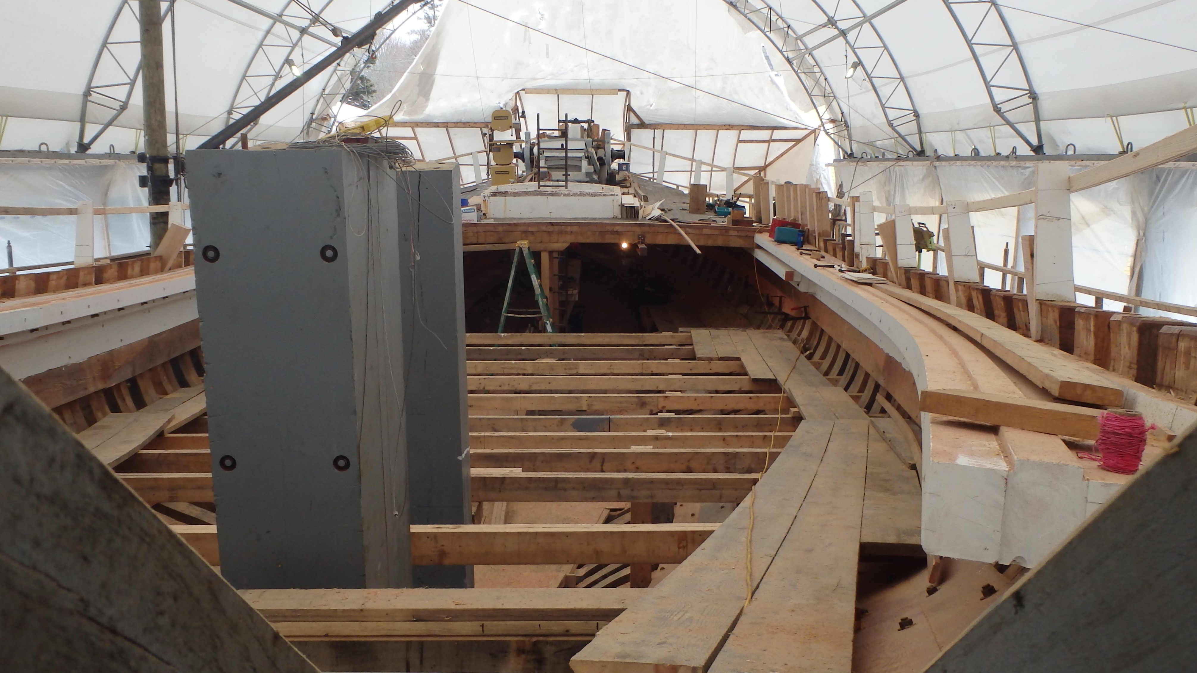 Bookmark the permalink.The gray vertical timbers on the center-left are the rudder and stern post. Running along the inside of the frames from the transom forward is the sheer shelf installed above the sheer clamp on the port and starboard sides.