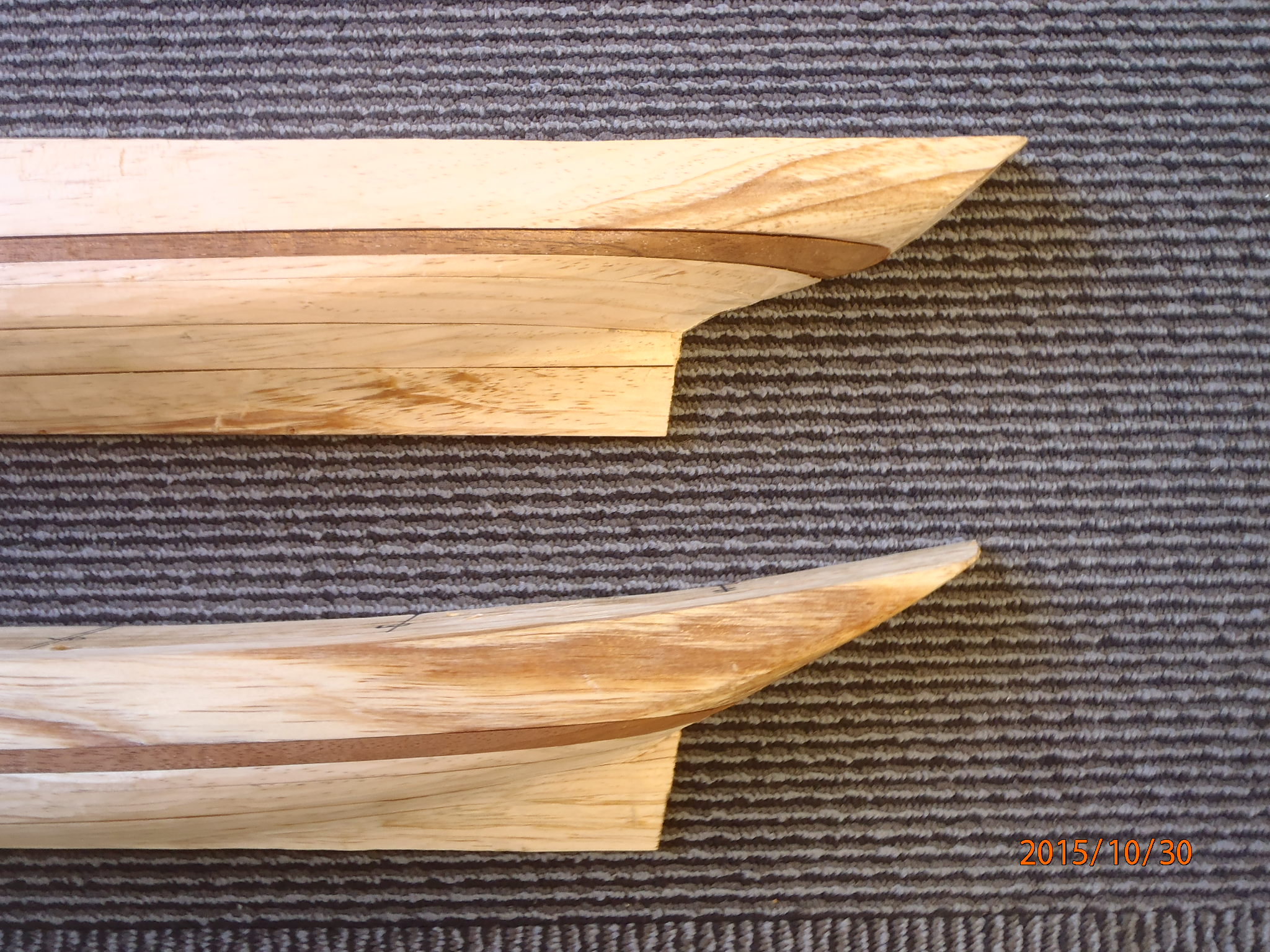 Close up of the sterns of two half models, crafted by Harold A. Burnham, showing the planned shear of the Ernestina-Morrissey. You can see a clear comparison of “before (top) and after (bottom)” The stern will be restored during the work the ship is undergoing now at Boothbay Harbor Shipyard