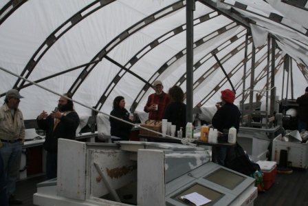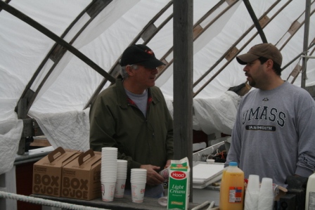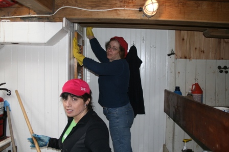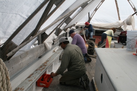 A great crew turned out to clean and scrape and oil for DCR’s Park Serve Day. The weather started cloudy but the sun soon heated the deck area under the winter cover. By the end of the day vents were cut in the cover to allow some cool breeze in.