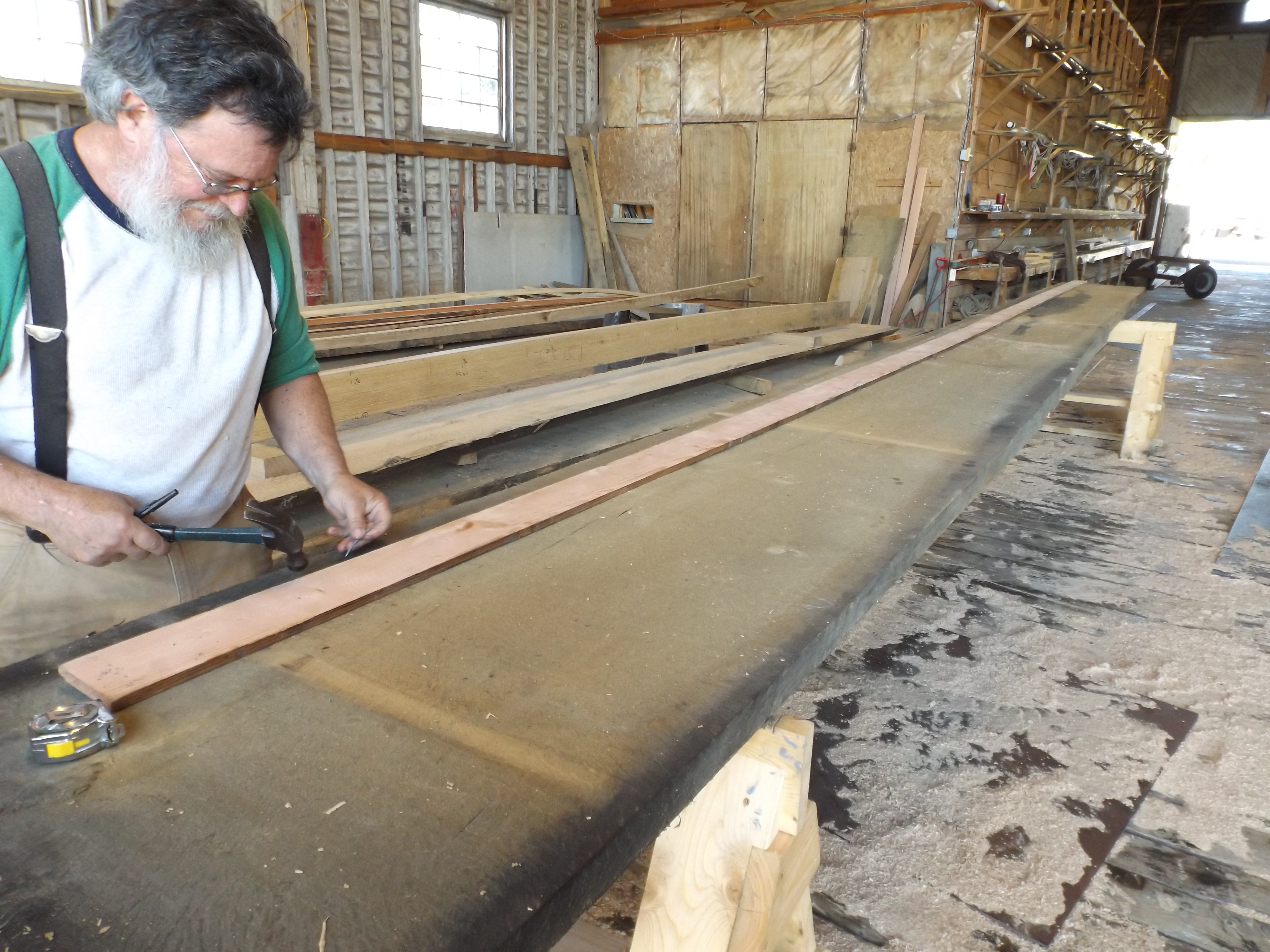 The 3 inch thick plank is marked and cut. Here a spiling batten is used to mark the curve needed for this plank.
