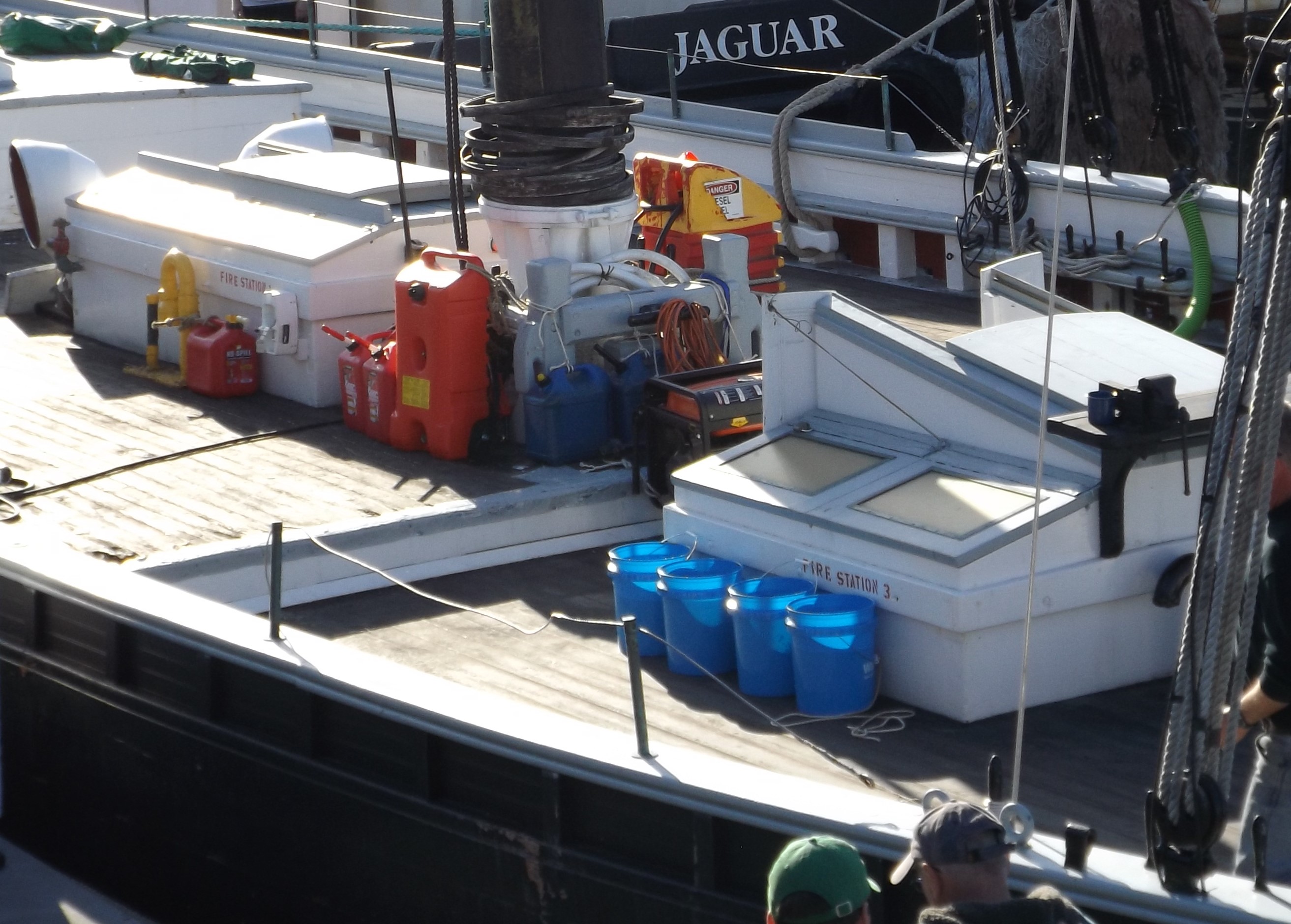 Supplies for the trip to Boothbay Harbor in 2015. Fuel for the generator is stacked around the main mast at the break in the deck.