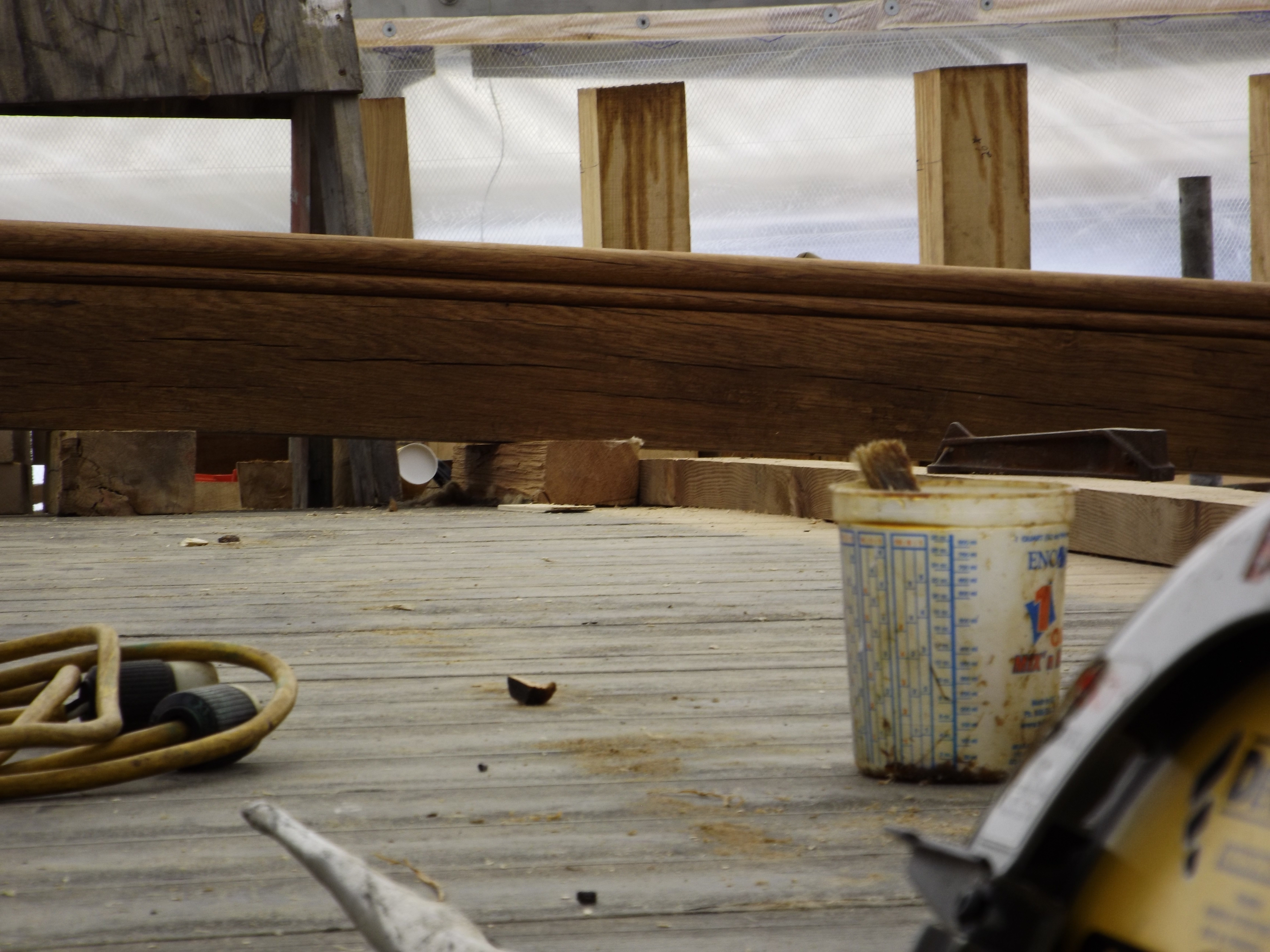 The new beam, with a carved bull-nose, is ready to be fitted into place.