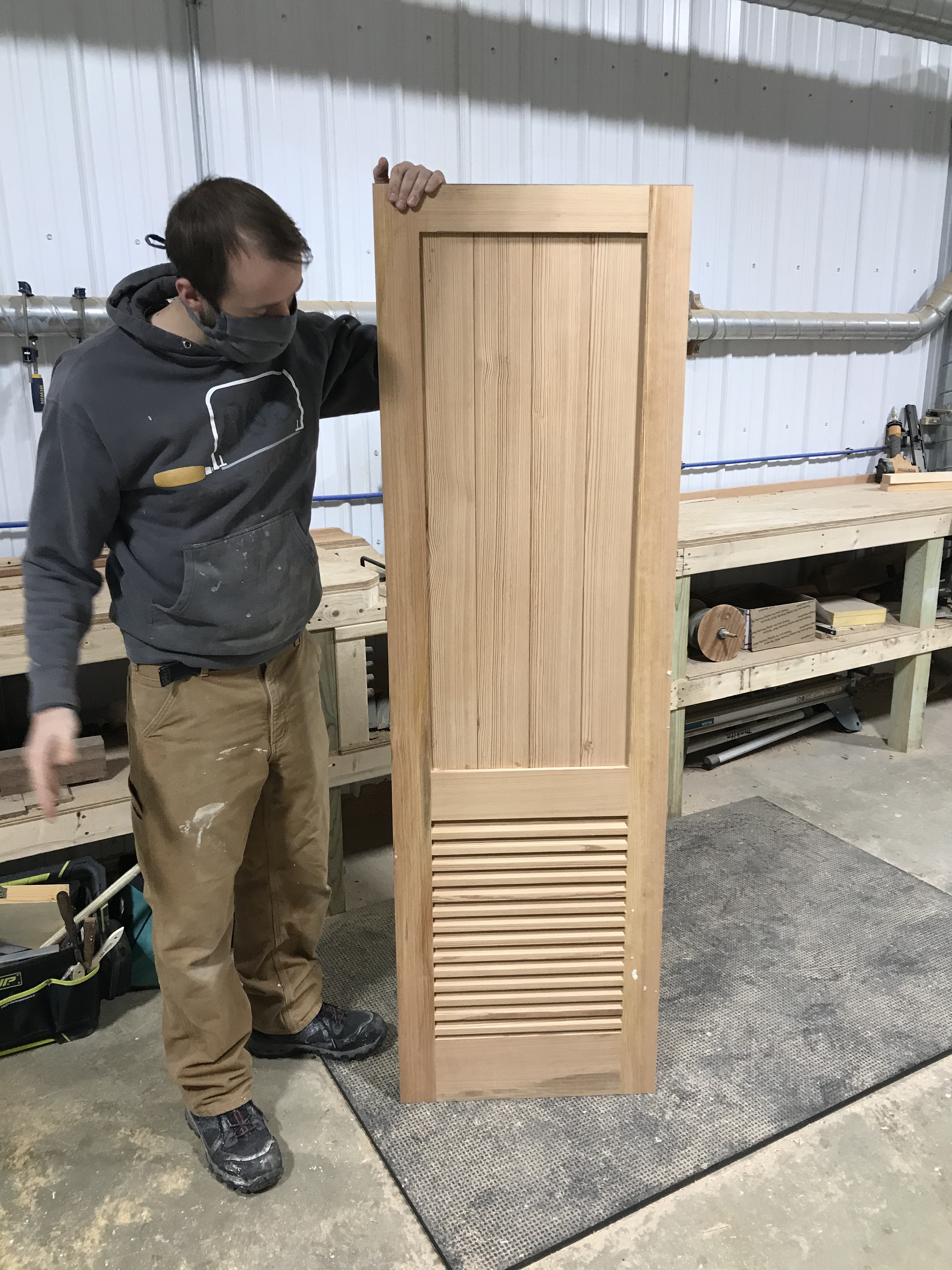This image shows one of our newest carpenters Kazimieras, who joined a few short months ago. He has been the man behind the head compartment installation in the Aft Cabin. Here he is showing off his most recent craftsmanship. This door will complete the head compartment project. It is currently in the paint booth being varnished before installation. We are all excited to see it hung in place next week.