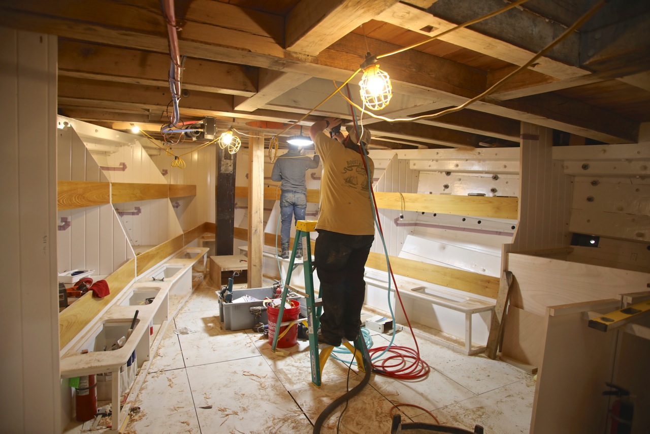 Kevin Danfelser and Jon Brassard have been busy with difficult overhead sanding and painting. The deck beams in the forward cabin are being finished to match the high quality painted and varnished surfaces throughout the boat.