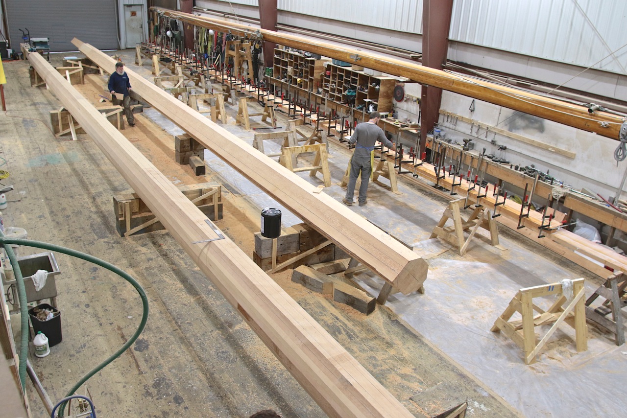 On the right side of the photo Kaz Buozys is checking clamps on the recent lamination for the main boom on the far side of the shop floor. David Short (blue shirt) is seen here wielding his template for shaping the foremast (on the right). The main mast (left) is already 8 sided in this image. Soon, the main and foremast will be completed and ready for coating before hardware is installed.