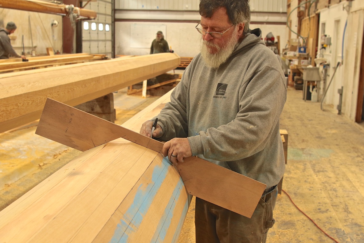 David Short monitoring the shaping process. You can see in this image the progress of bringing the Main Mast from 8-sides to 16-sides. This process begins with a chainsaw to rough-cut the mast from a square laminated block into an 8-sided spar. From that point, the crew uses power planes to bring it as closely to round as possible before sandpaper finishes the job. In this image, sandpaper is not far off.