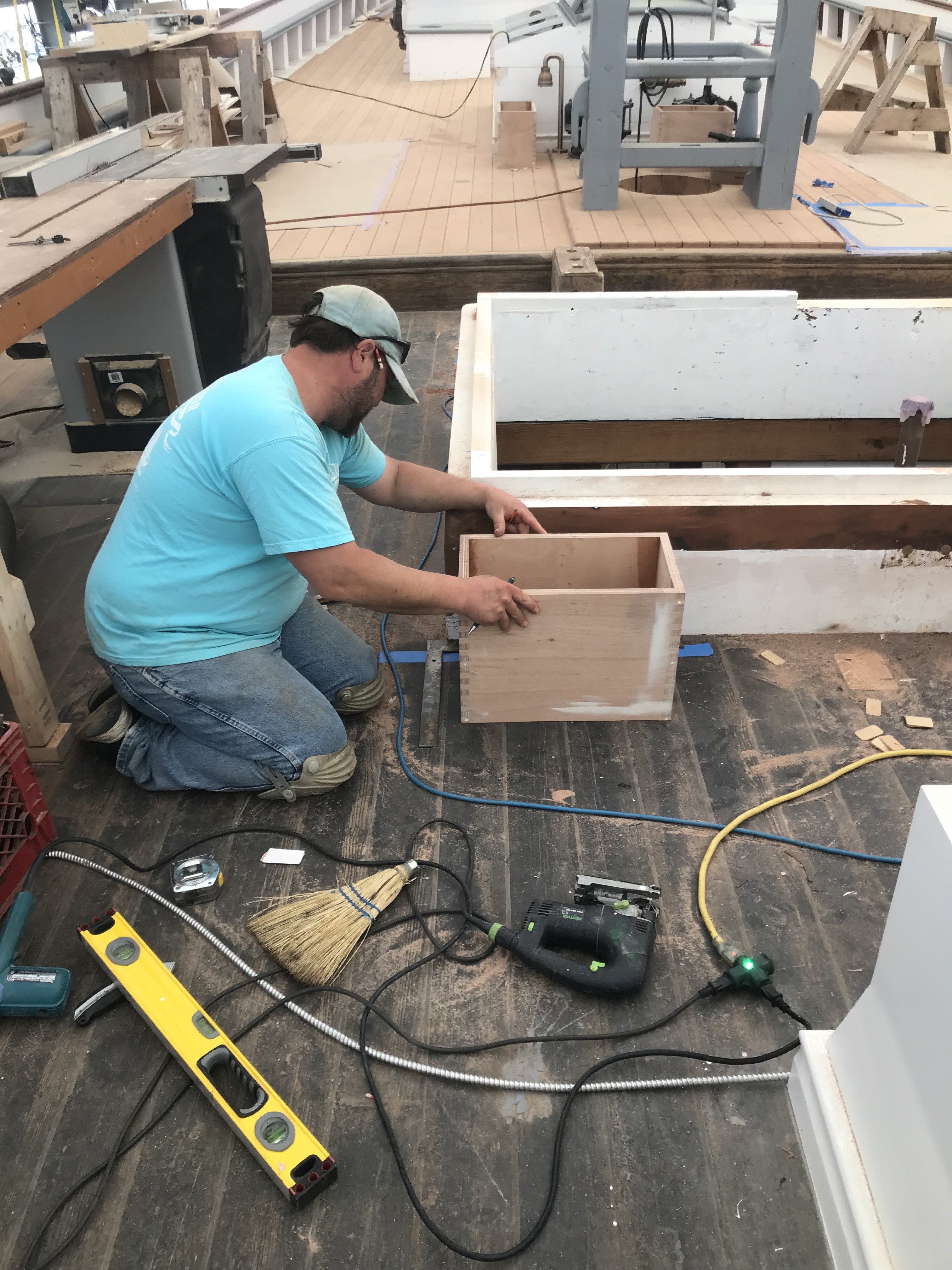 Jason Brassard is busy scribing the new dorade boxes to the deck in front of the Main Cabin Housetop. These boxes will help maintain ventilation in the space all while keeping water from dripping into the interior.