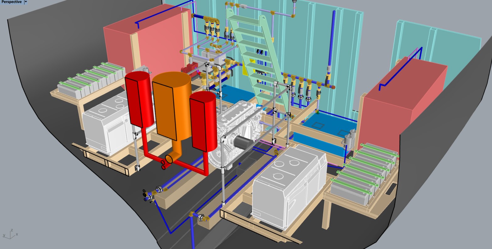 This is a 3D model of the engine room on Ernestina-Morrissey. Our talented design team is working hard to define all interior spaces well ahead of later installations. This helps us be as efficient as possible when it comes time for engines, tanks, and plumbing to join the ship.