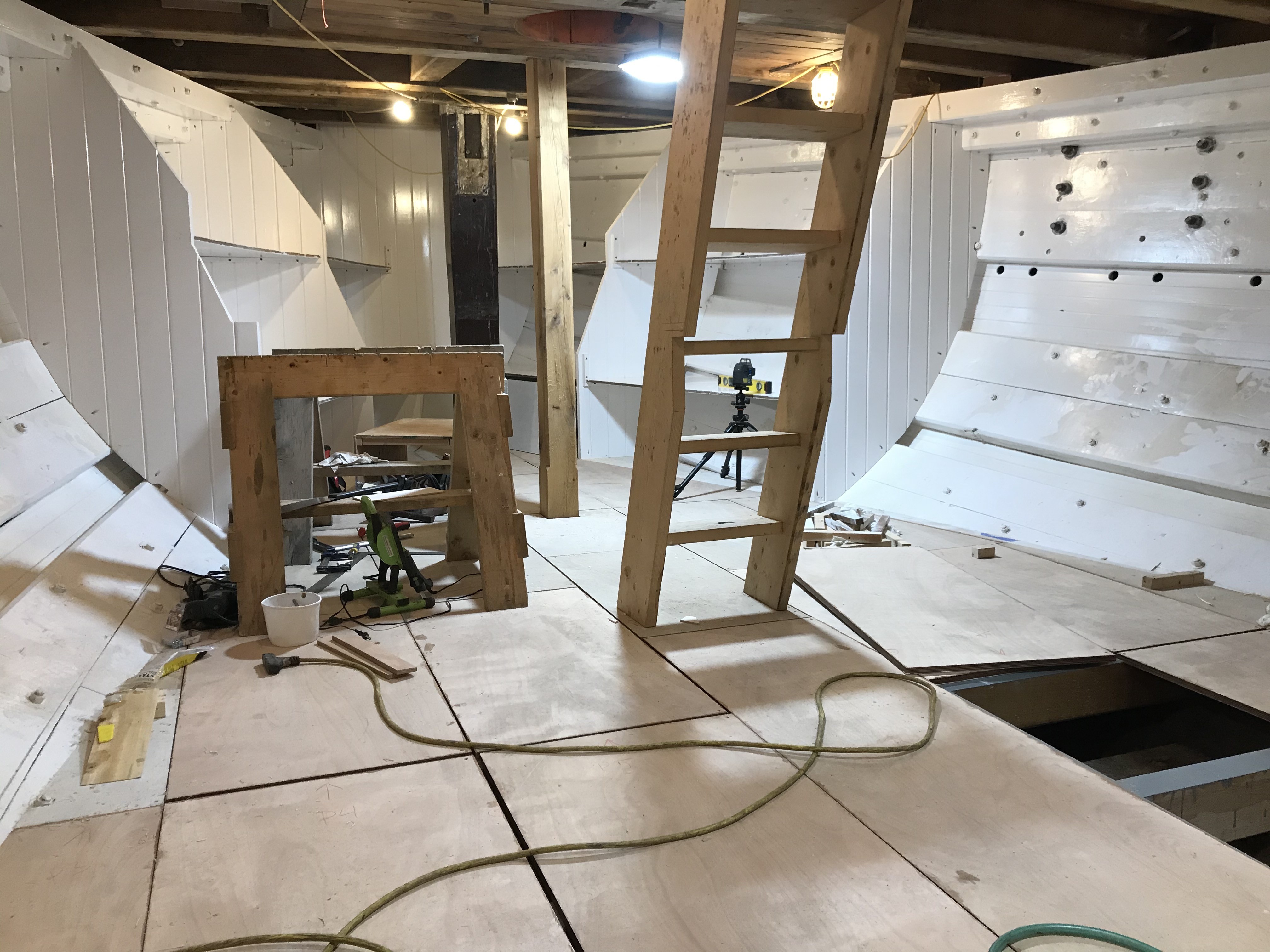The crew is excited to be fitting out the forward cabin. This space will be a busy area of the ship, where the galley and crew mess are set to be located. You can see the bunks and partitions being painted as we work our way aft through the space.