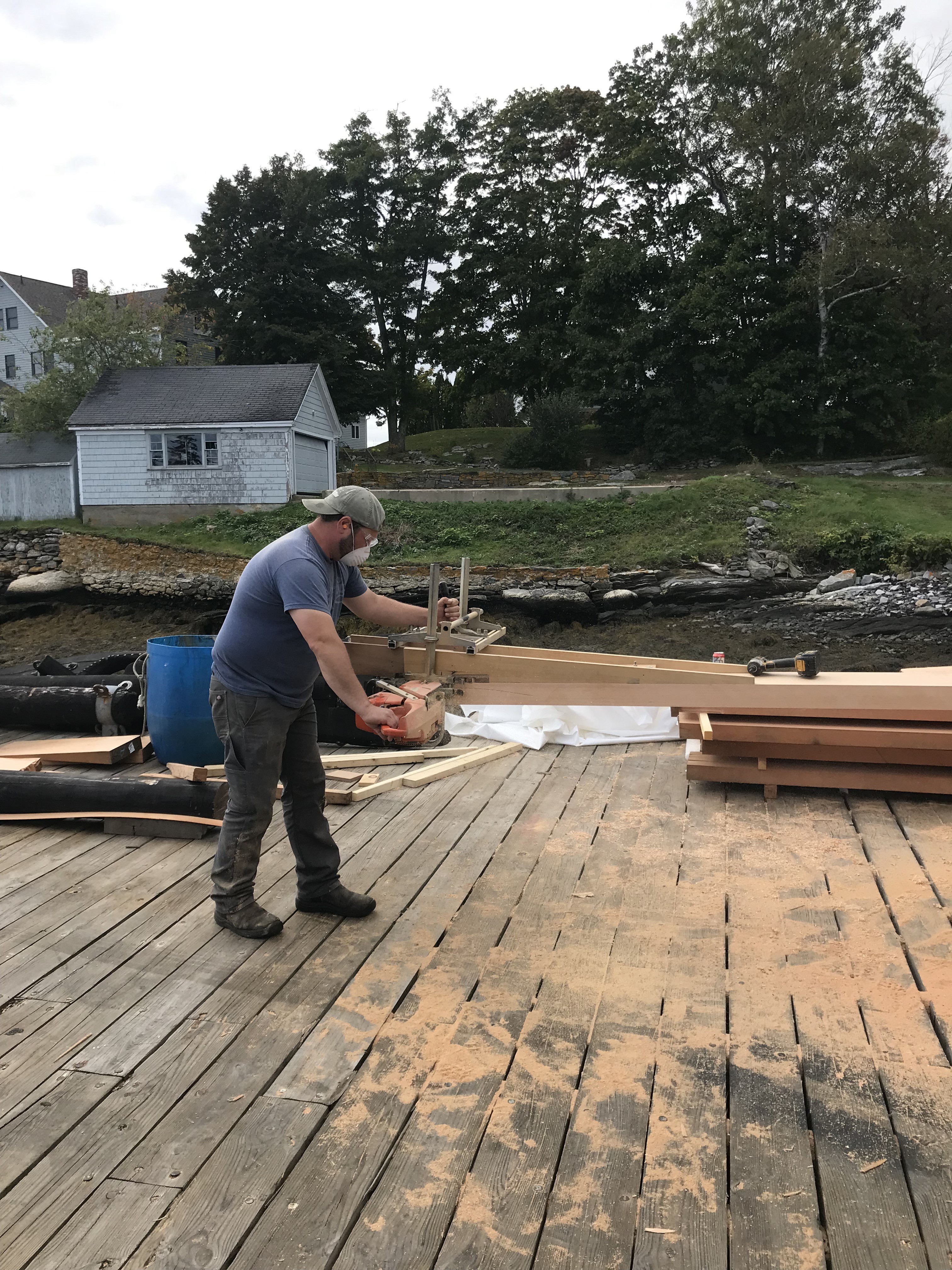 Jason Brassard is carefully using our chainsaw cutting jig to prepare 12:1 scarf joints for the lamination of spars. This method is how we will connect 30′ and 40′ long pieces of wood together to make masts and booms that will ultimately extend up to 80′ long.