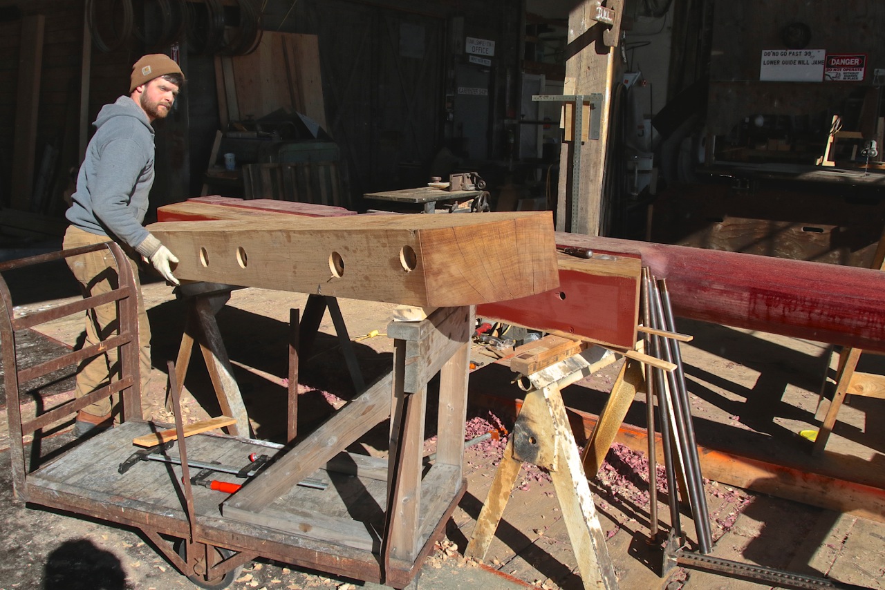 The next section it lifted into place. The holes are drilled and a countersink to accommodate the nut is ready. The void around the nut will be filled and tarred as you can see in the first photo. Photo Credit: Mitchell Photography