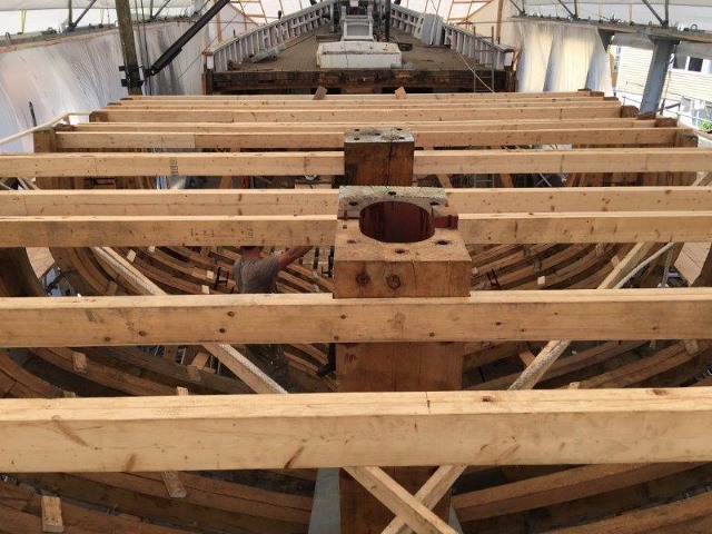 IMG_2417 temporary bracing will be removed as deck beams go into place stern and rudder posts 20160816 credit H. Burnham (640×480)